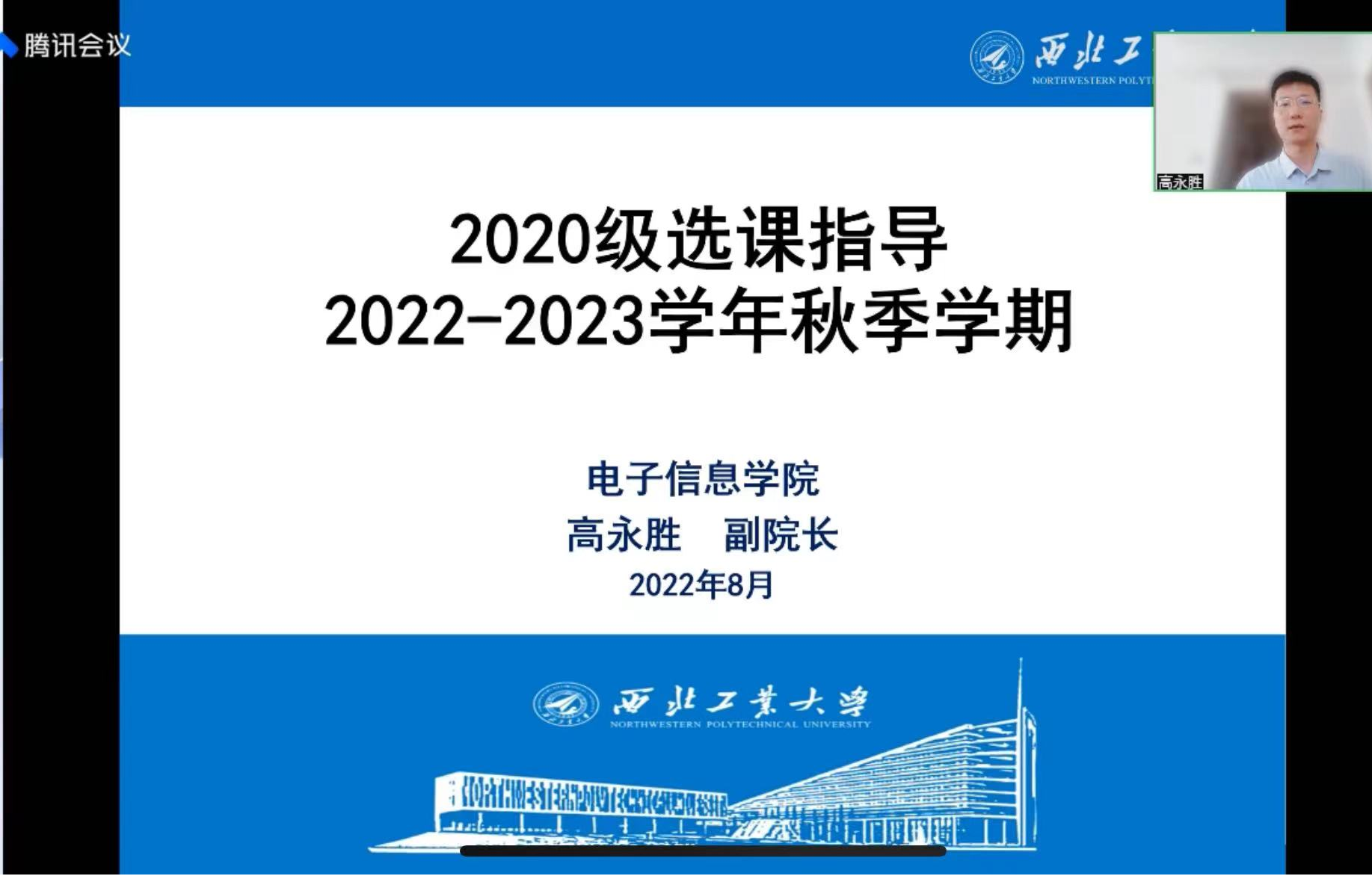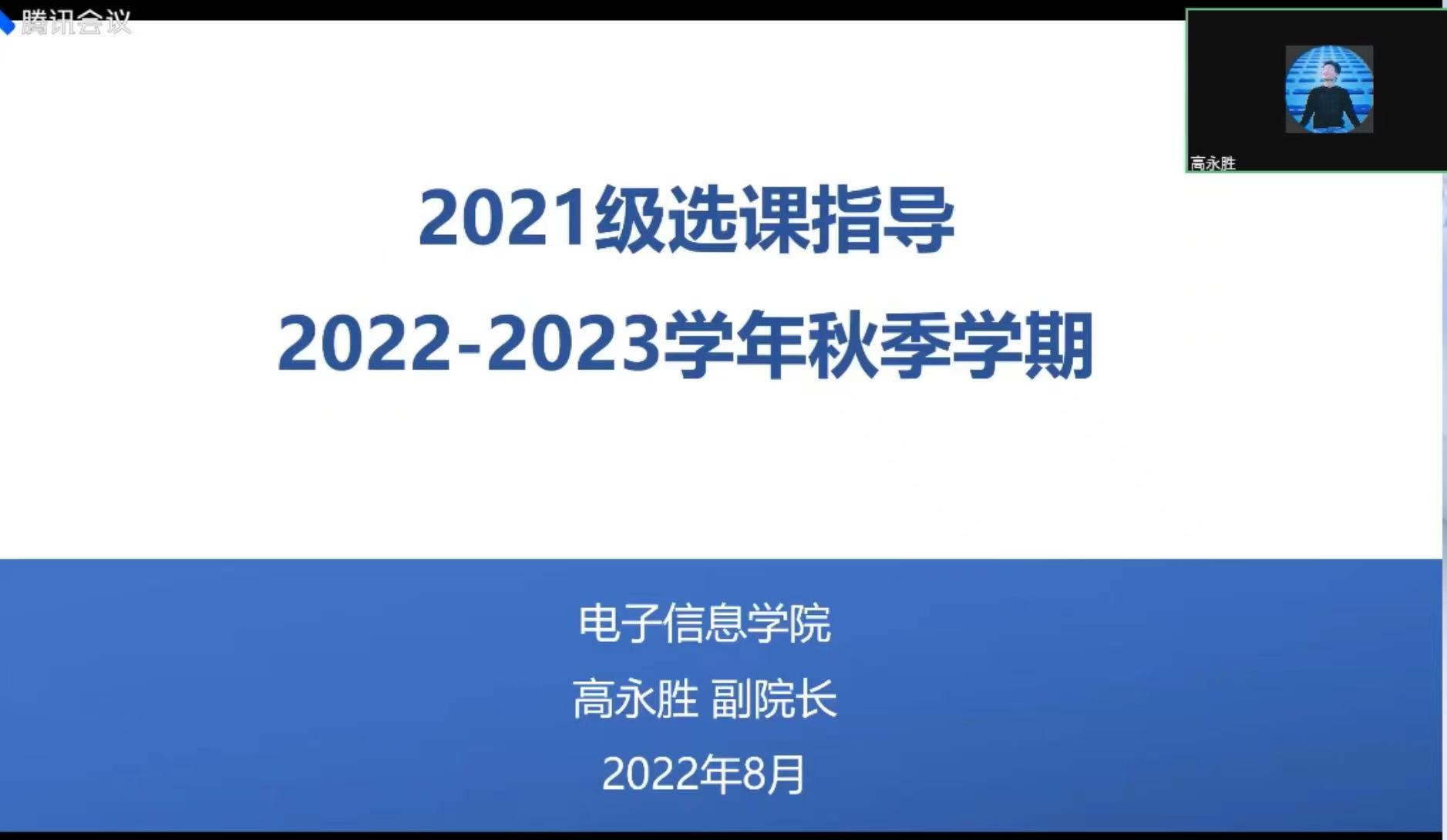 于8月14日上午,面向2020级和2021级本科生线上召开了2022-2023学年秋季学期选课指导会。学院副院长高永胜,专业综合设计类课程任课教师丁君、粟嘉、李枭扬,本科教学秘书何可、杨瑾,以及2020级和2021级电子信息类专业本科生参加了本次会议。会议由本科教学秘书杨瑾主持。