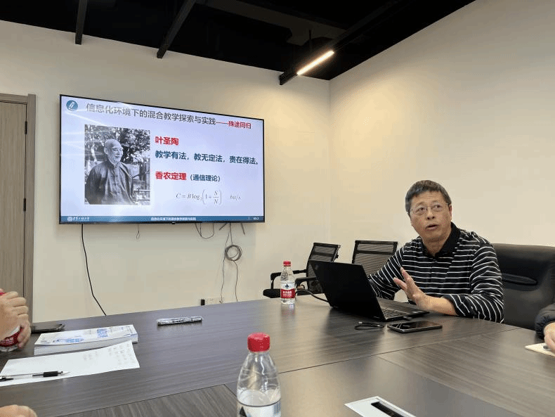 随后,陈树新作了有关混合教学与探索的专题报告。首先,对混合教学的理论和发展历程作了介绍:混合教学把传统学习方式的优势和数字化学习、网络化学习的优势结合起来,充分发挥教师教学过程中的主导作用,以及调动学生学习的主动性、积极性与创造性,成为知识传播产业十大顶尖新兴发展趋势之一。接着,陈树新进一步分享了作为导师的指导经验,他强调青年导师要充分落实严管督教,严格各项培养环节,同时也要牢记把立德树人放在第一位,当好学生的良师益友。