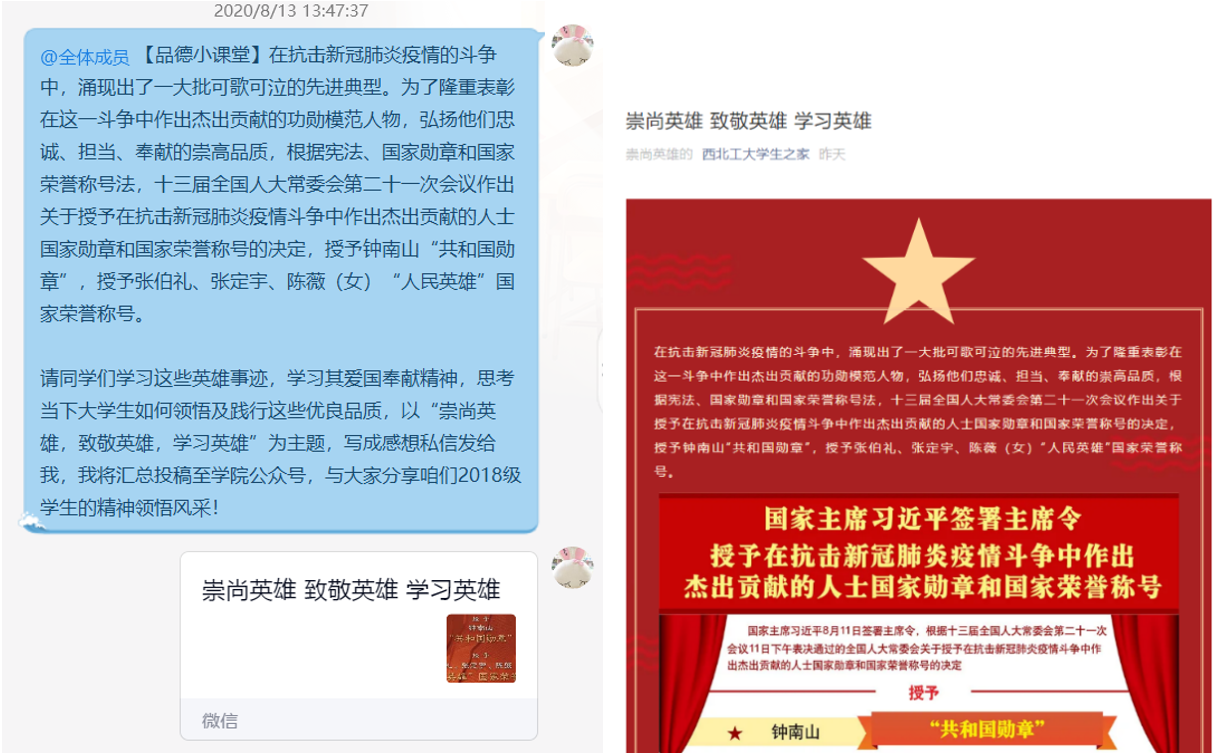 “1+5+X”的学生价值塑造培养体系中的举措之一,教育引导学生坚定理想信念、厚植爱国主义情怀、加强品德修养、增长知识见识、培养奋斗精神、增强综合素质,努力培养德智体美劳全面发展的社会主义建设者和接班人。本期“品德小课堂”带领同学们学习在抗击新冠肺炎疫情的斗争中的英雄事迹,学习其爱国奉献精神,并引导学生思考当下大学生如何领悟及践行这些优良品质。