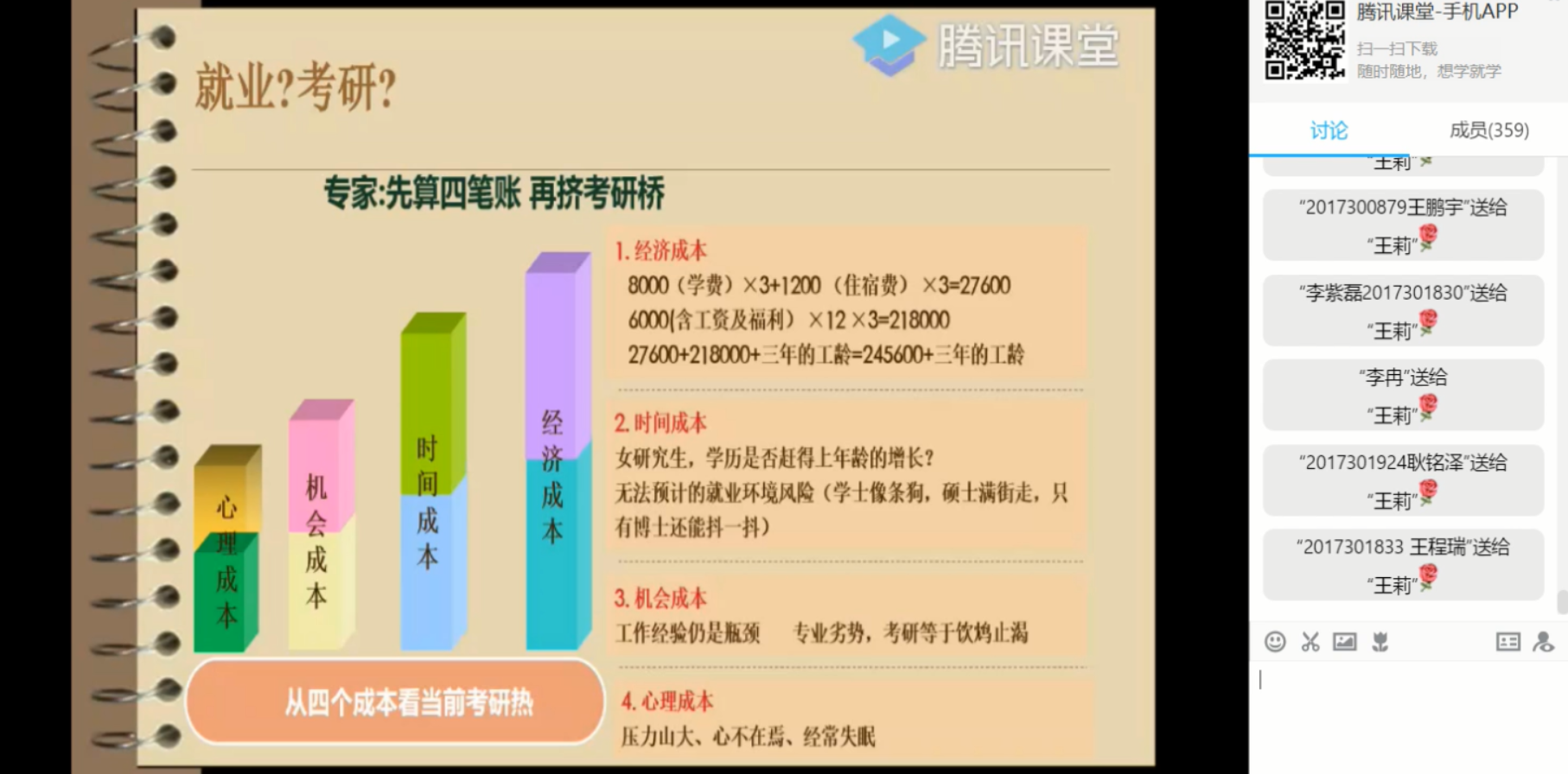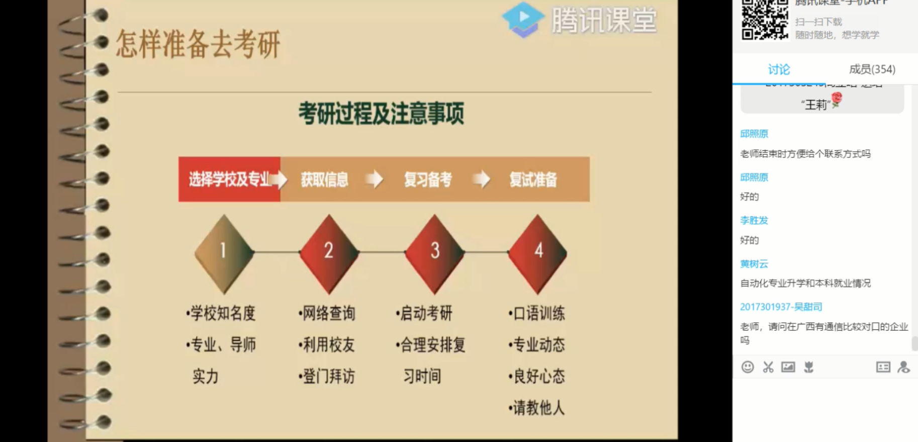 在如何准备方面,王莉老师分别讲解了考研的决策因素以及风险评估,并针对本走光