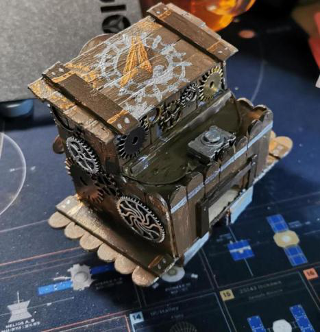 “本组作品以《飞屋环游记》为灵感,以“飞屋”这个点子,再加上材料中提供的小风扇,创作出这样一个作品。主体木屋的下方是四个推进器,以帮助屋子“升空”。木屋的后方是螺旋桨,用于控制方向。木屋的装饰方面,我采用了蒸汽朋克风格,用棕色,金属色为木屋上色,同时用齿轮装饰。屋顶上是设计上稍有改动的西工大校徽,既能装饰,又代表了工大学子腾飞之心”