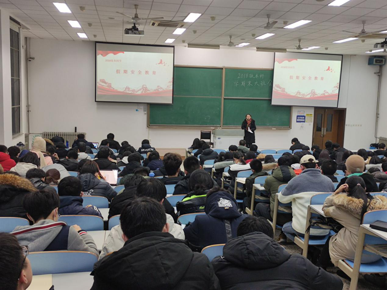 本科2018级在教学西楼D301开展了寒假安全教育暨表彰的主题班会。2018级全体学生参加会议,F1岗辅导员樊晔主持会议并讲话。