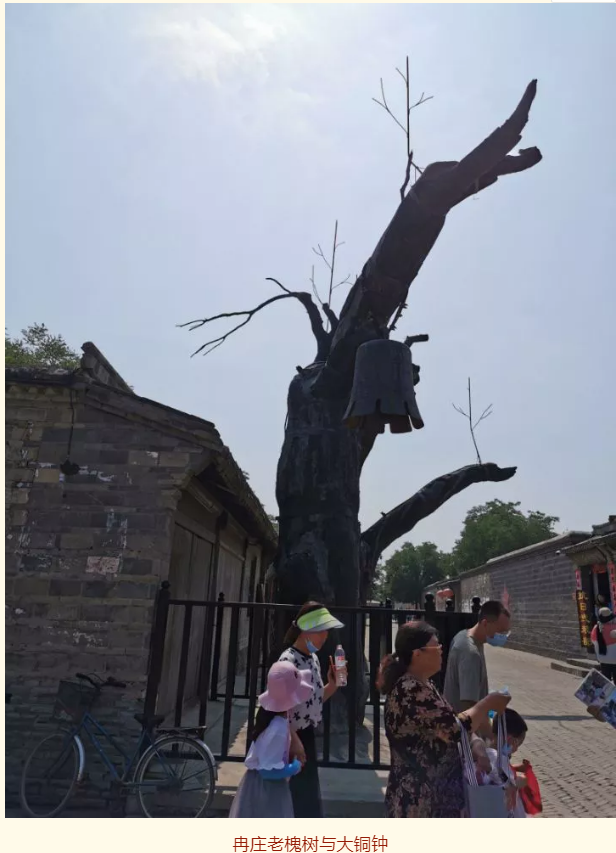 从地道口出来,就来到了冉庄地道战遗址。遗址中最著名的是村口的老槐树。1965年拍电影《地道战》时,古槐枝叶仍现生机,上世纪70年代干枯后作为遗址被保留在原地供参观。电影《地道战》中的大铜钟、村公所、柜台工事以及高墙工事等在冉庄一一呈现,保存完整。