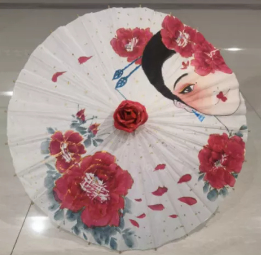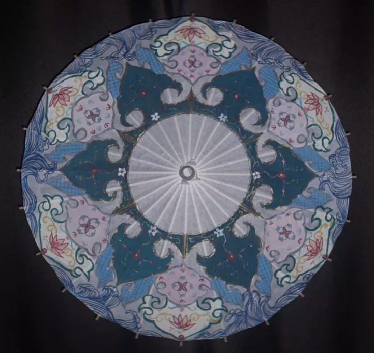 在绘制过程中,我们参考了诸多唐宋壁画,根据他们的服饰妆容,我们绘制了颇具唐宋风格的肖像和装束对画面进行美化,用象征着富贵的牡丹对伞面进行修饰,在伞尖用象征着祥瑞的传统红纸手工制作了一朵惟妙惟肖的牡丹。在绘制过程中同时采用水彩国画的结合,后期还用到洒金的技巧去点缀伞面。伞面绘画寓意唯美。错过了长安古意,失约了洛阳花期,我在姑苏马蹄莲里,瞥见你兰舟涉水而去。
