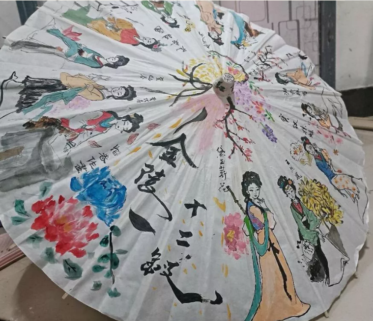 我们根据红楼梦的故事内容,结合书法艺术,绘制了黛玉葬花、宝钗扑蝶、湘云眠芍等经典场景,人物在构图中的安排分组就像电影的一组组镜头循序映出,摒弃了焦点透视的绘画概念,不但打破了时间、空间的限制,而且离开了自然景的特定位置,只有形象的主次统一画面。每个人的身边是她们自己的意象花,伞中心是四季的代表花,向外延展开来,伞柄上绘制花枝,花枝上的伞面定格了十二位姑娘如般的美,也就是花冠,红楼则是花蕊。我们伴随着红楼梦的主题曲作画,将心中的感情投注在了绘画过程中。这把伞不仅浸透了我们对红楼的爱意。同时,我们一起制作,收获了快乐,这把伞也承载着我们之间的感情。