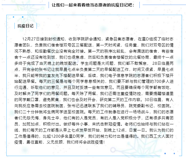 研究生会执行主席,在担任核酸检测志愿者期间,主要负责的志愿工作是现场待检测人员的排队秩序。她说,没有从天而降的英雄,只有挺身而出的凡人,工大加油!西安加油!