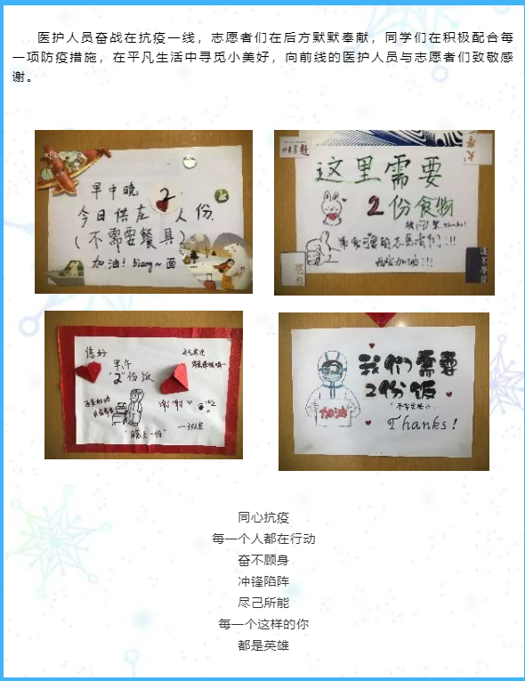 志愿者积极参与物资搬运、秩序维护、协调引导。为学生们送上一日三餐,为所有学生不出户、不聚集提供物资保障。