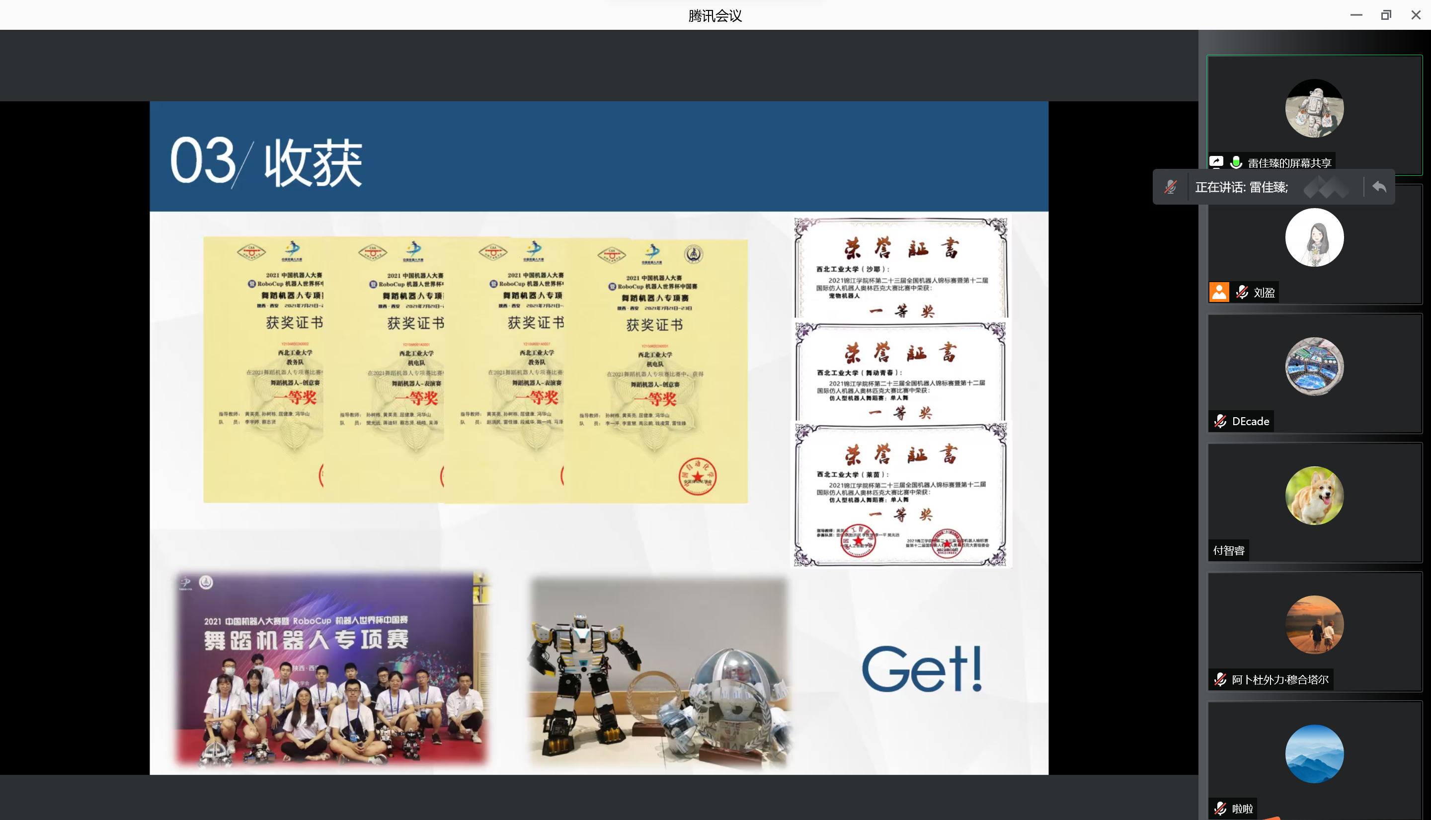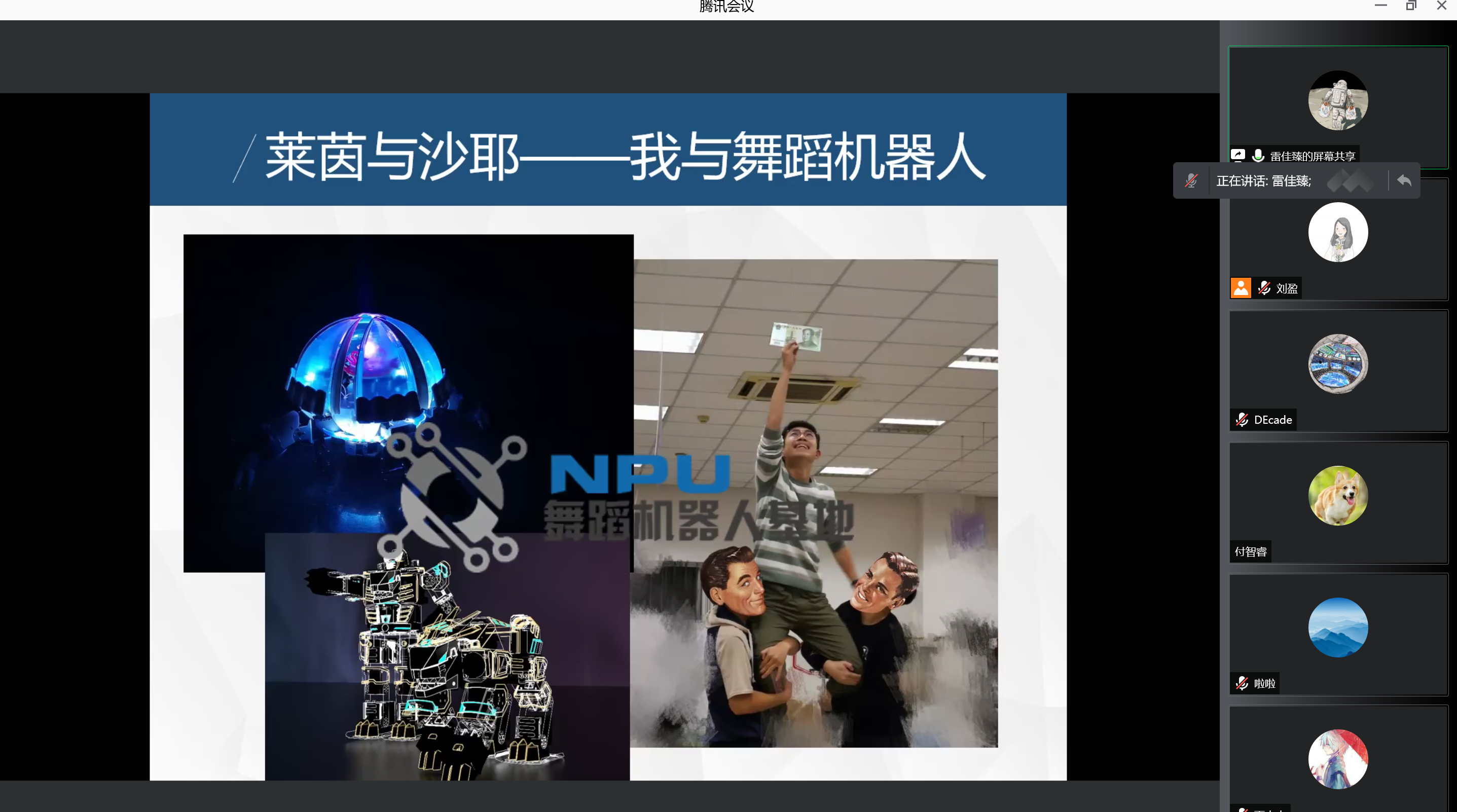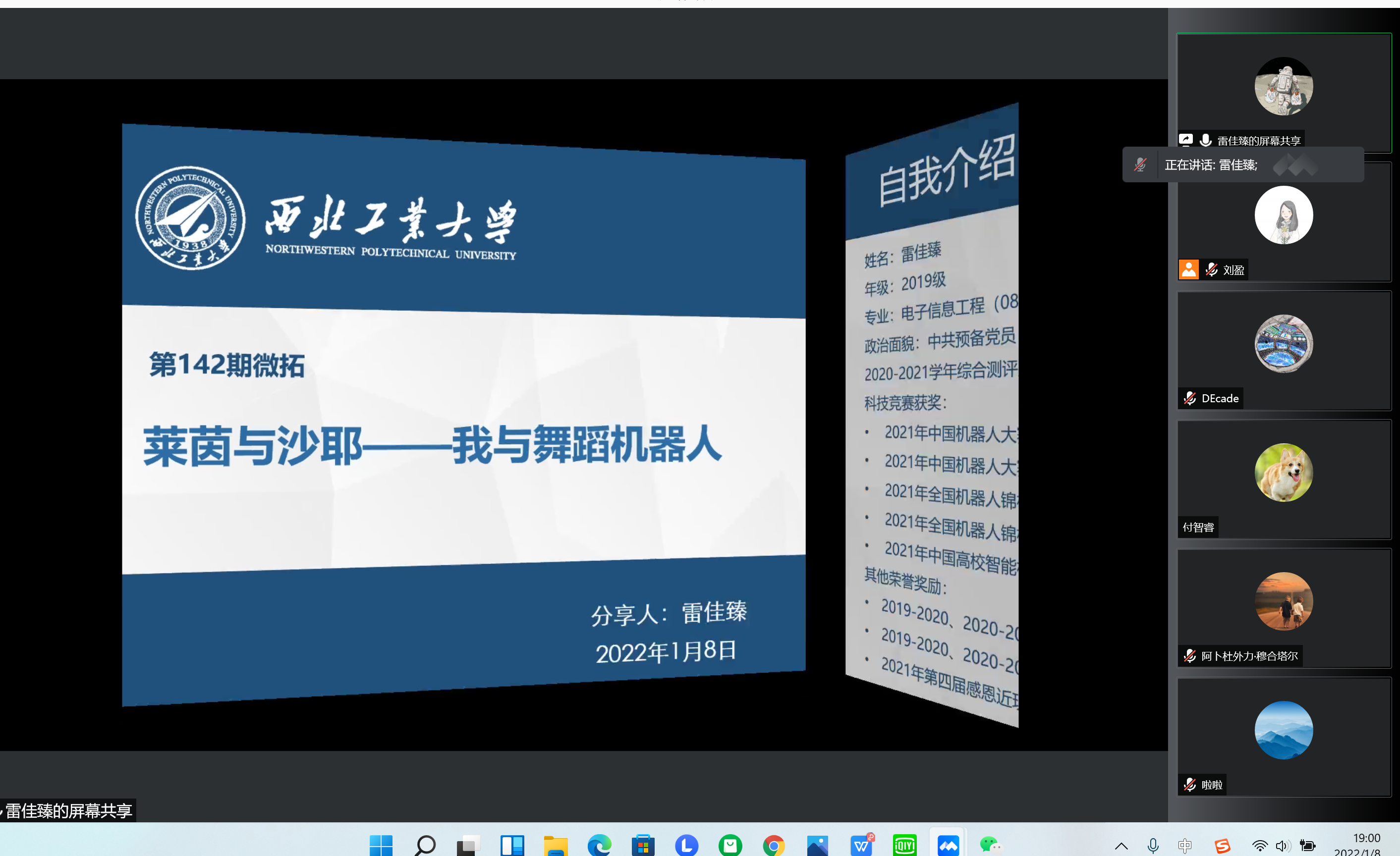 2019级电子信息工程专业本科生雷佳臻。从初识到接受挑战到最后收获成果,主讲人分享了自己与舞蹈机器人的故事。首先,主讲人向大家介绍了加入舞蹈机器人创新实践基地以来一年半的时间里的学习经历、备赛经历、比赛经历。随后,阐述了参与机器人莱茵与沙耶的创作时遇到的各种挑战和自己的应对方式,以及舞蹈机器人带给自己的成功和感动。随着主讲人提出自己对大学与竞赛关系的独到见解,本次微拓活动圆满结束。