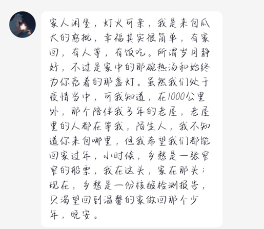 由于疫情加剧,12月23日西安市进入封闭管理。政策的变化让西工大的同学们陷入对未知的迷茫中。此时,“互助文档”的出现,缓解了同学们对物资供应的不安;“晚安计划”的出现,更是抚慰了同学们焦躁不安的心情。为此,走光