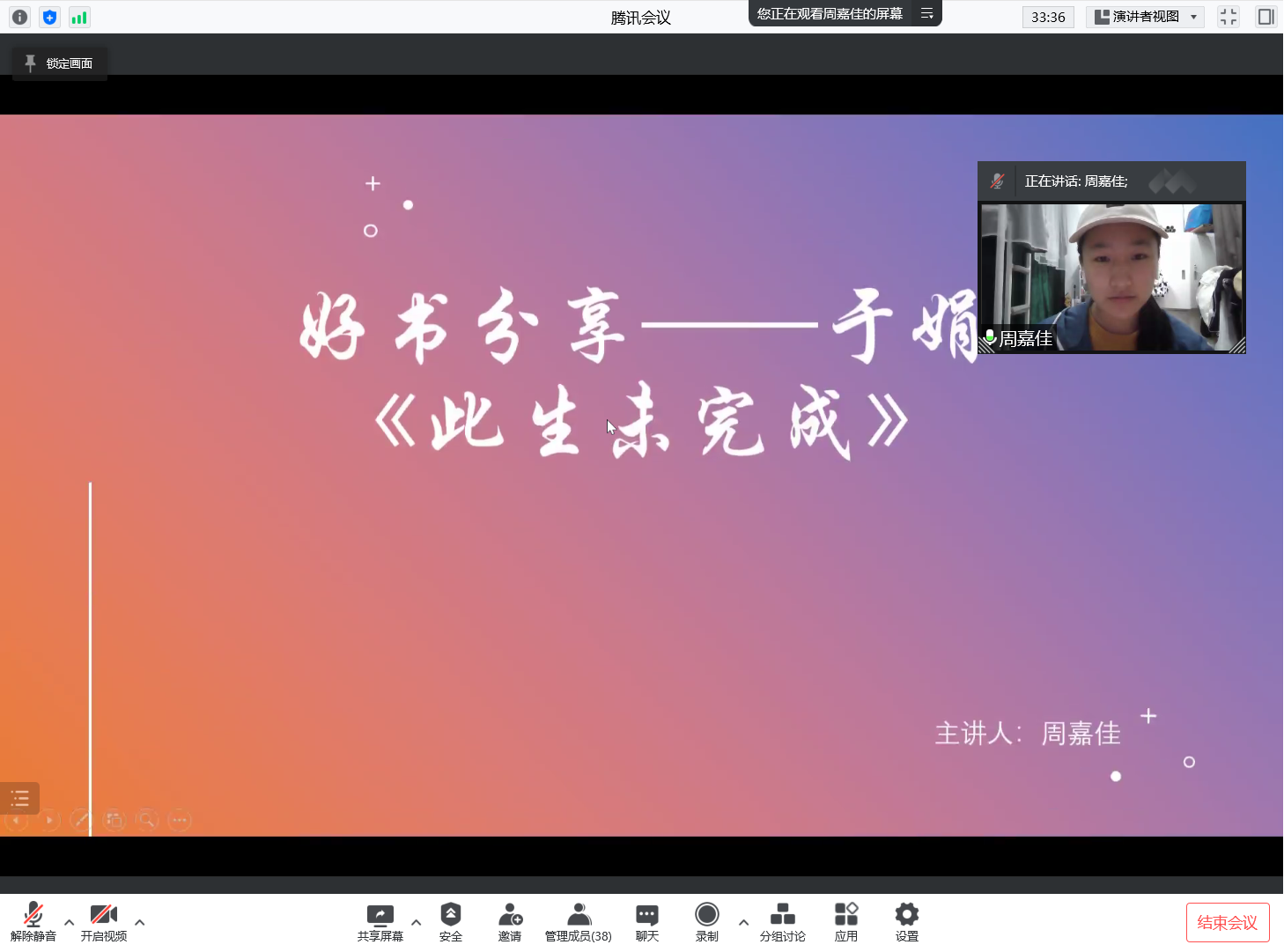 4月15日晚上,由我校党委学工部主办,走光 承办的“微拓”-WE TALK学术沙龙第150期通过线上会议的形式举行。本次活动主题为“好书分享—于娟《此生未完成》”,主讲人周嘉佳是走光 2020级本科生,曾获国家励志奖学金、校二等奖学金以及社会服务先进个人、学业先进个人、“优秀共青团员”等荣誉表彰。