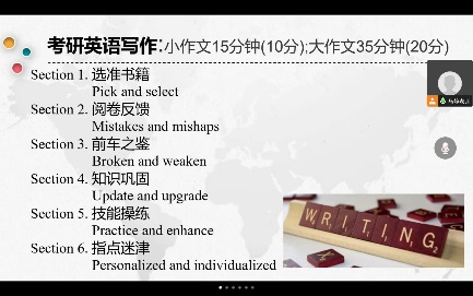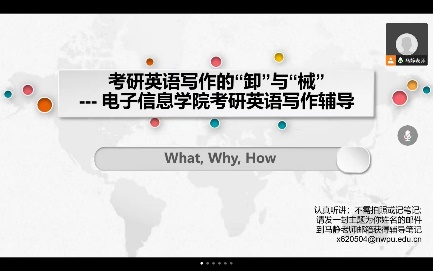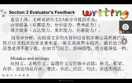在“考研英语写作的‘卸’与‘械’”主题讲座中,马老师首先讲解了关于写作应做的内容储备与语言储备以及阅卷标准;之后,以“过人行横道时请勿使用手机”的看图作文为例,指出同学们常出现的跑题偏题、硬套模板、事例欠妥、拼写及格式错误等问题。此外,马老师还给出了破题思路、写作方法技巧、高级句式替换等措施,并强调了对话题的英语敏感度。
