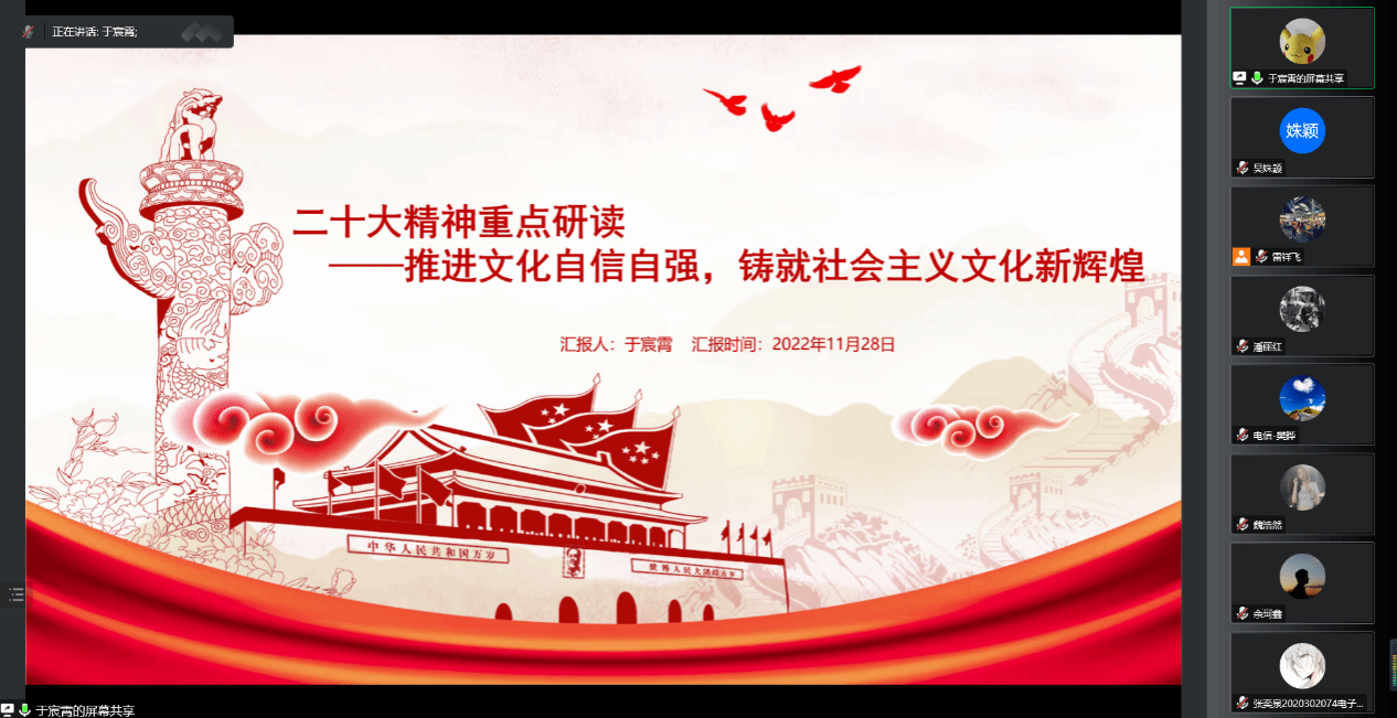 支部党员于宸霄同志从文化自信的内涵、意义和表现,以及如何增强文化自信四个方面深入研读剖析了文化自信,引用原文,字字斟酌,深入浅出。列举2022北京冬奥会等实例,呼吁大家自信地继续传承中华民族优秀传统文化、继续传承这种文化自信的精神风貌。