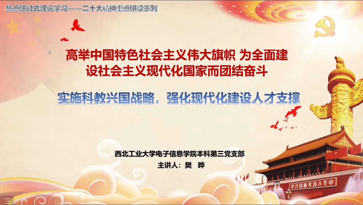 支部书记樊晔同志首先结合报告内容,分析和解读了科教兴国战略在新时代的科学内涵和使命任务。党的二十大报告强调科教兴国战略,并将科教兴国战略、人才强国战略、创新驱动发展战略摆在一起,将教育、科技、人才整合到一起进行系统谋划,共同服务于创新型国家建设。樊晔同志强调,作为新时代的青年,我们要不畏艰难、守正创新、勇担责任,为建设社会主义现代化强国而奋斗。
