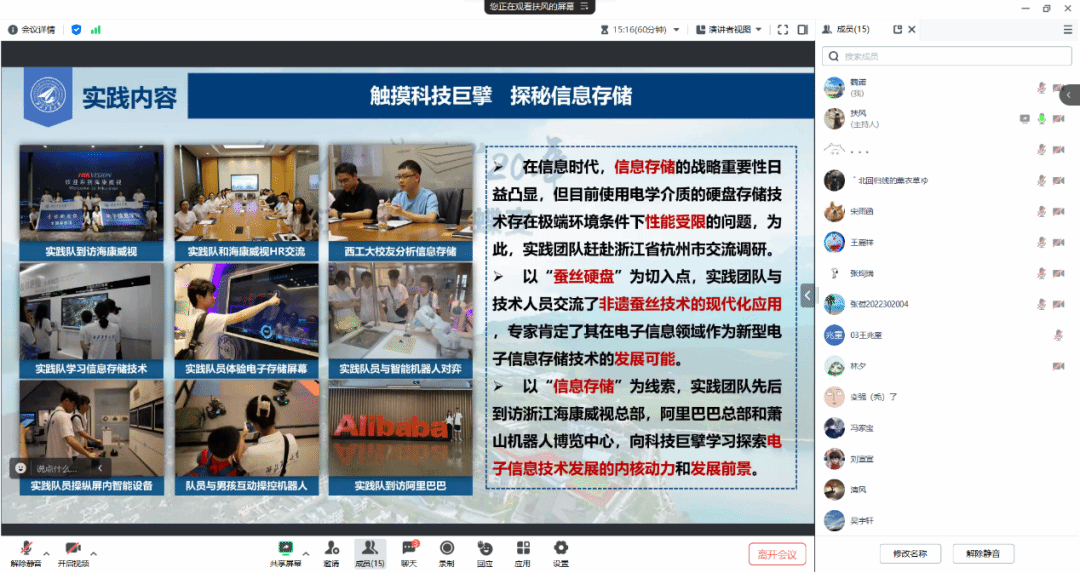 首先是刘佳乐同学关于“蚕丝之织,电子之道”社会实践的分享。刘佳乐同学从主题选择、实践准备、内容、总结等方面为同学们做了详细讲解。其中涉及的“蚕丝存储硬盘”立足科技前沿,力求用数字化、信息化的科技力量传承传统文化。刘佳乐同学还强调了合理采访和记录的重要性。