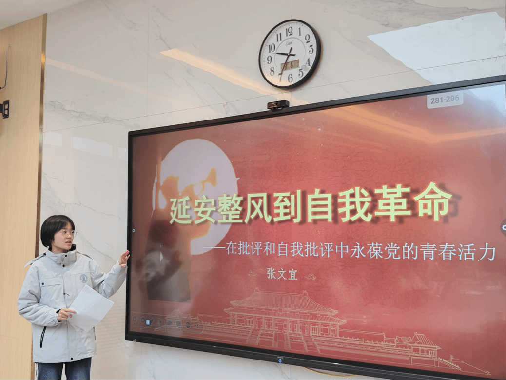 在学习过程中,青年宣讲团张文宜同学通过组织进行专题教育、集体思考以及观看视频等形式,让团员和青年深入了解“延安整风运动与中国共产党的自我革命”的重要价值和深刻意义,激励我们学会自我批评与互相监督,不断反省自身,从而推动我们个人的成长与进步。