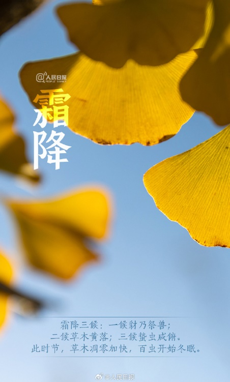 霜降时节,万物毕成,毕入于戌,阳下入地,阴气始凝,天气渐寒始于霜降。由于“霜”是天冷、昼夜温差变化大的表现,故以“霜降”命名这个表示“气温骤降、昼夜温差大”的节气。