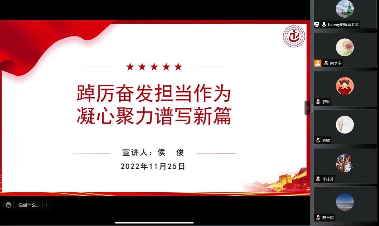 采取线上形式召开教工党支部书记例会,党委书记侯俊以“踔厉奋发担当作为,凝心聚力谱写新篇”为题进行党的二十大精神宣讲。党委副书记高敏、全体教工党支部书记参加会议。