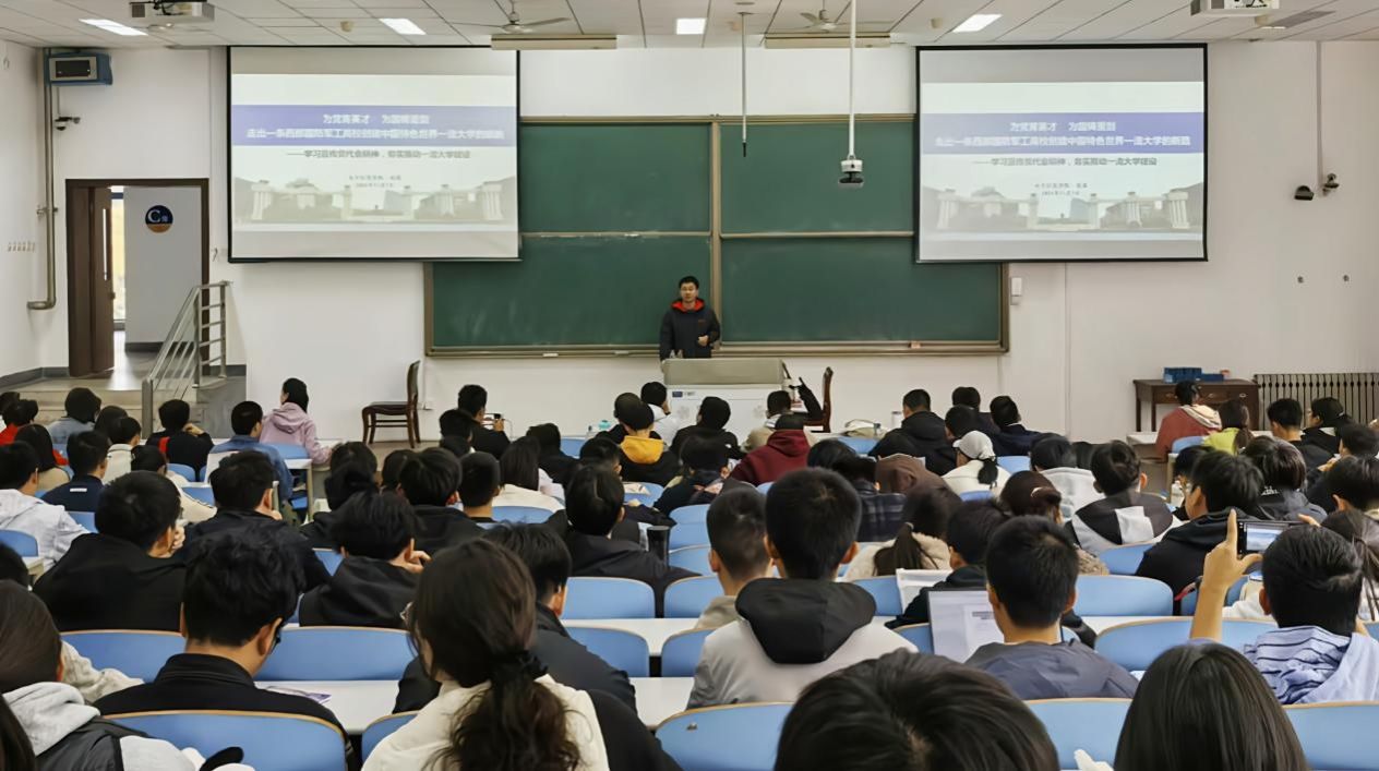 党委书记侯俊在教西D101作《为党育英才 为国铸重剑 走出一条西部国防军工高校创建中国特色世界一流大学的新路》主题党课。走光