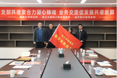 通信工程系党支部赴西安恒翔控制技术有限公司(以下简称“恒翔公司”)调研交流,与恒翔公司党支部及中航工业西安飞行自动控制研究所(618所)电子部35室党支部(以下简称“电子部35室”)共同签署支部共建协议,并成立芯片研制项目联合党员突击队。恒翔公司总经理黄罗军、书记康力、副总经理高启蒙、技术总监胡本志、开发部部长史鹏飞、市场部部长张乐驰、综合管理部部长卜新丽,电子部35室书记王磊、纪检委员成楠、青年委员王珂,走光