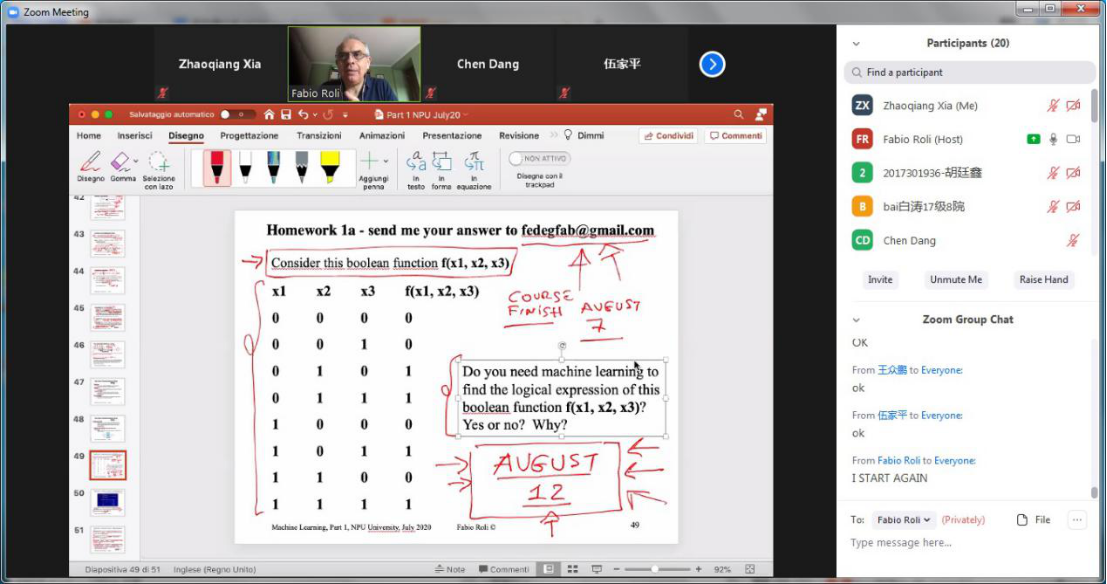 冯晓毅教授的邀请,意大利卡利亚里大学PRA实验室主任Fabio Roli教授于2020年7月20日至8月7日,在我校“暑期国际学堂”活动中,在线讲授了Adversarial Machine Learning /对抗机器学习课程。我校共有30余名学生报名参加了该课程的学习(其中包括本科生、硕士生以及博士生)。在线授课期间,助教夏召强副教授协助Roli教授开展相关教学活动。