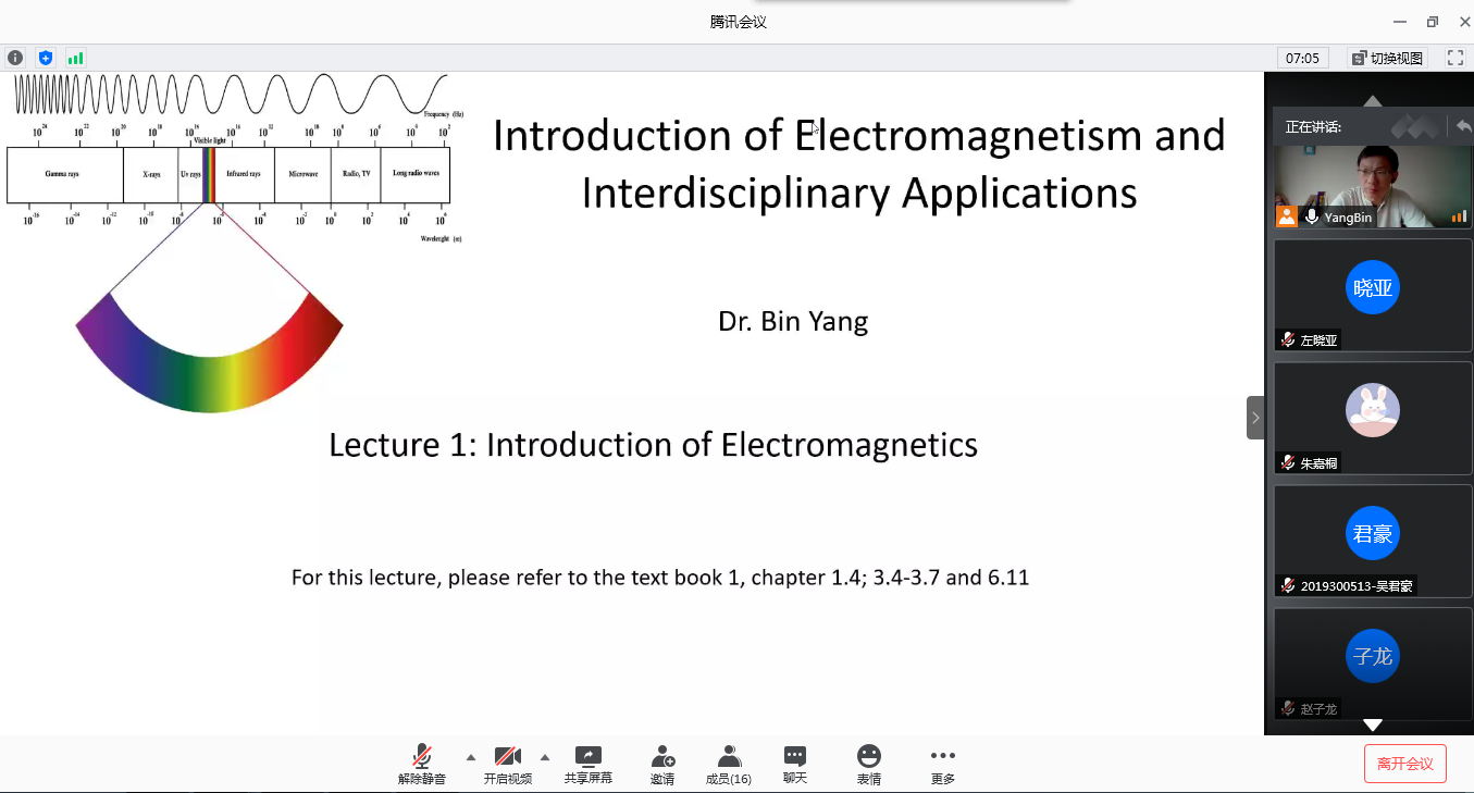 Introduction of Electromagnetism and Interdisciplinary Applications /电磁原理和交叉学科应用暑期课程共32学时,Bin Yang博士的授课在腾讯视频会议软件上进行,授课进行了2周,每周的周一到周五的下午5:00到8:00(附加2个小时在线仿真实验讲解)在线授课。他的讲课联系电磁基本知识和前沿科学研究相结合,共分为5大部分内容:1)通过电磁波和频谱基础理论,讲解不同频段频谱的生活应用;2)通过讲解电磁波在介质中的传播理论,讲解使用电磁波来研究物质特性的工具(包括XRD, SEM,TEM, Raman, RFID和XPS)和数学手段;3) 通过讲解电磁波的辐射理论, 讲解射频识别技术和新型柔性电子对应的射频识别设计;4) 通过讲解微波技术,来讲解5G通信相关的材料表征方式,包括自由空间和波导法; 5) 在课堂上大量演示matlab实际编程算法处理, 已经微波CST 电磁仿真的实际设计操作。 整个讲课过程,鼓励学生全英文回答问题,提出问题。Dr. Yang在每节课结束后,都留有5分钟时间,让学生们提问。