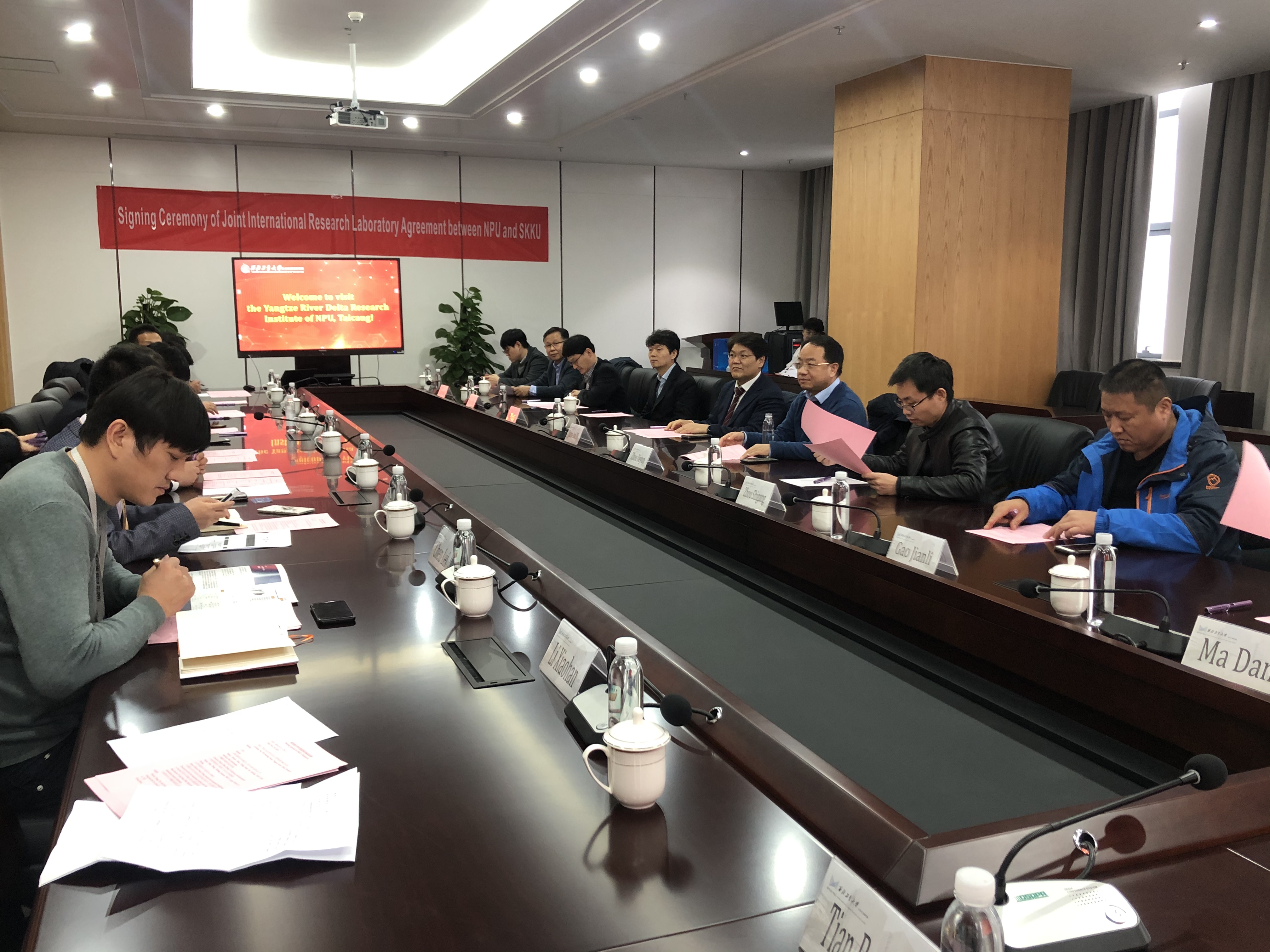 随后,访问团就太仓校区、长三角研究院建设发展情况,建立西工大-成均馆大学联合研究实验室进行座谈交流。郑曦常务副院长代表长三角研究院与太仓校区管理委员会热烈欢迎访问团一行的来访;长三角研究院张铁邦副院长介绍了长三角研究院情况;周德云院长简要介绍了我校和成均馆大学关于合作办学的进展和筹备情况,并介绍了国际联合研究实验室的科研方向和目标;张富利处长表示大力支持我校和成均馆大学的合作办学,并提出了明确要求;郑曦常务副院长作了总结发言,代表太仓校区管委会和长三角研究院表示大力支持我院与成均馆大学建立国际联合实验室落户太仓。座谈结束后,June-Ho Yi院长和周德云院长签署了国际联合研究实验室合作协议;张富利处长和郑曦常务副院长共同为长三角研究院国际合作部揭牌。