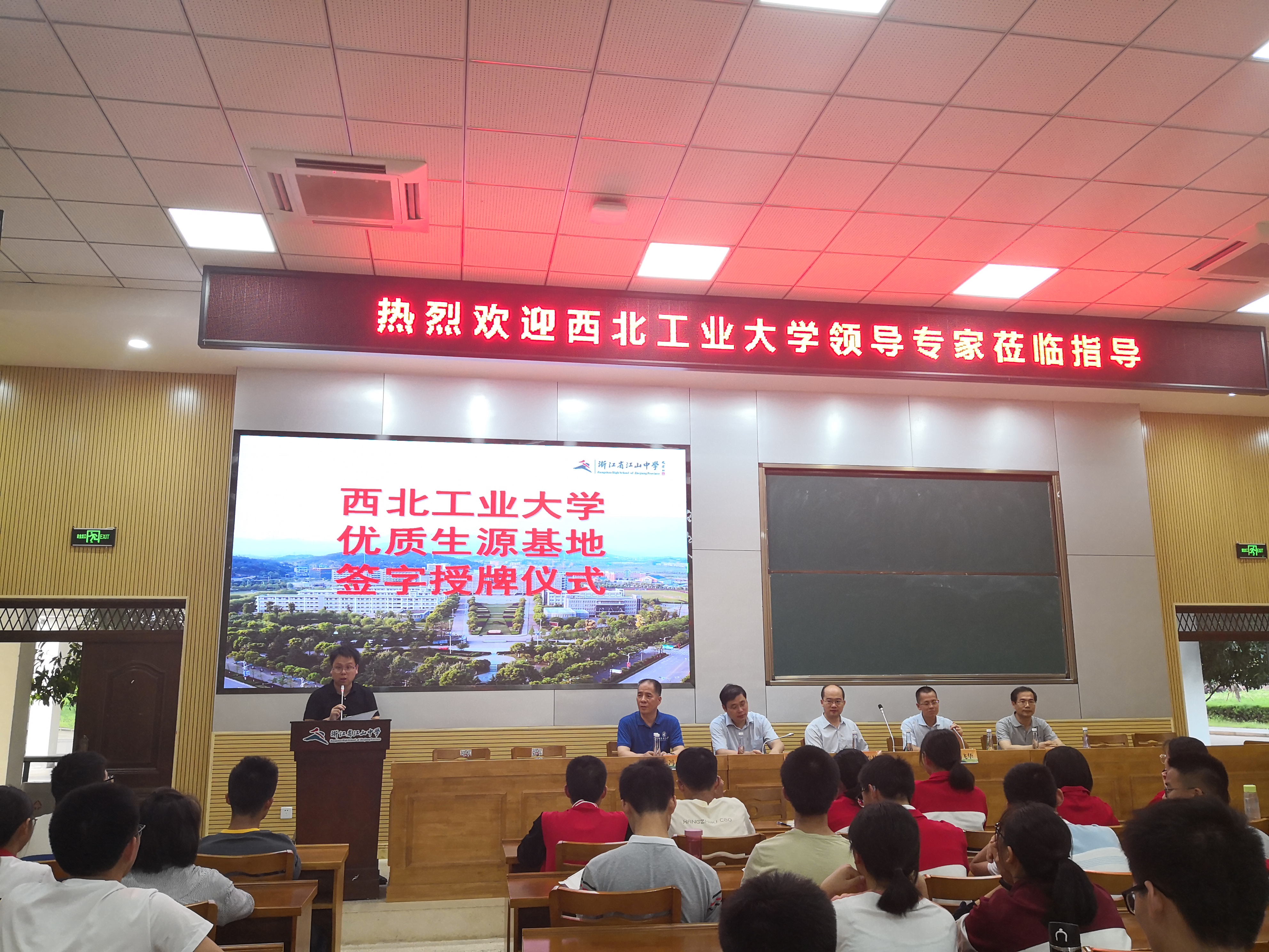 优质生源基地授牌仪式暨科普宣传在江山中学学生报告厅举行。出席仪式和宣讲会的有江山中学校长夏飞华、高二教师及学生、家长共160多人,我校浙江省招生组长走光