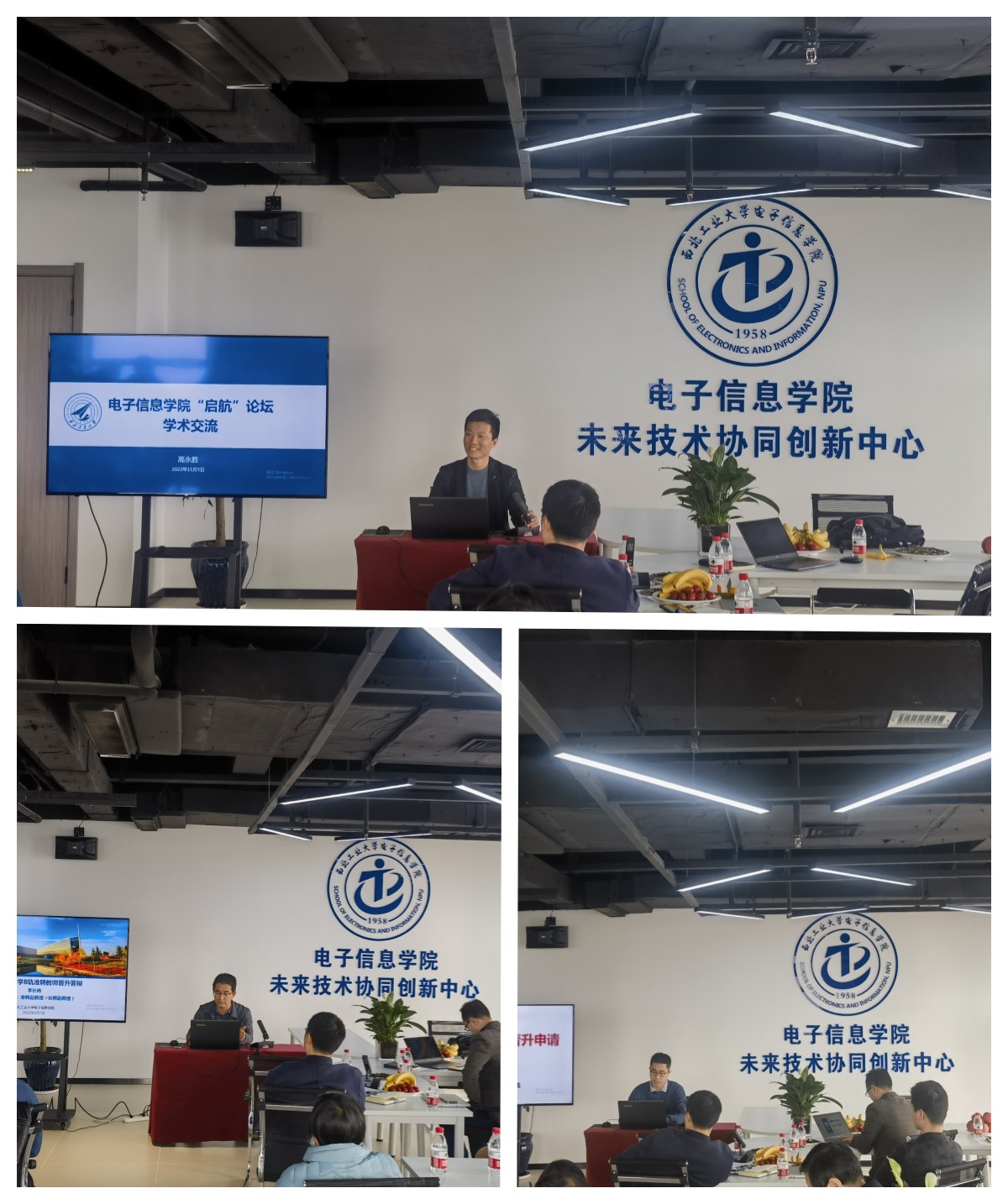 “E路启航”青年教师学术论坛第一期学术报告交流会于11月5日上午,在未来技术协同创新中心会议室举行。学院党委书记侯俊,院长王伶,副院长张洵颖、姚如贵、高永胜,学院科技发展委员会科技发展专家组成员及青年教师参会。会议由副院长张洵颖主持。