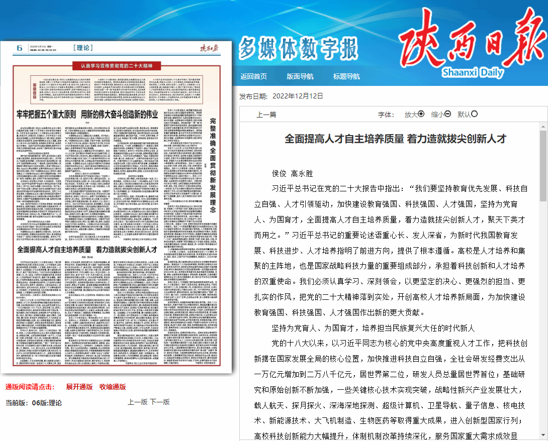 侯俊、高永胜署名的理论文章:“全面提高人才自主培养质量 着力造就拔尖创新人才”。