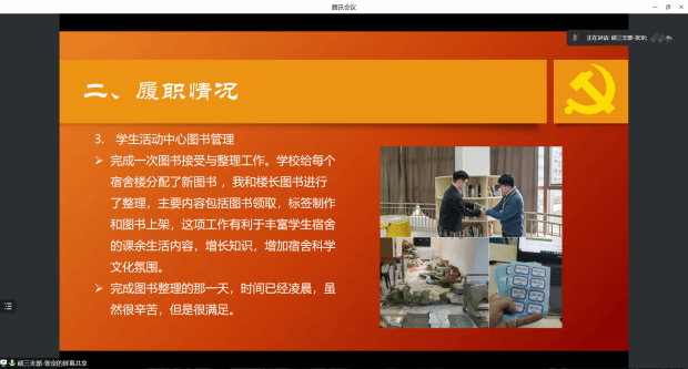 经前期各学生党支部考核推荐,共有24名学生党员参加本次评优答辩,各参评党员就其所任岗位的履职情况进行了述职汇报。