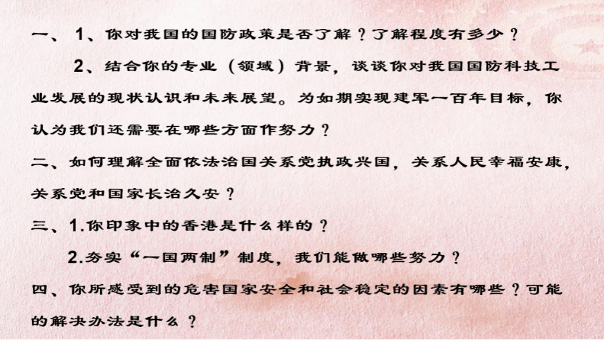 雷光宇同志结合军理及思政课学习内容说明我国现行国防政策以及其政治性、防御性、人民性和自主性的特点;王馨乐同志从电子信息专业领域出发,结合当下我国国防科技工业发展现状及军队发展现状给出现阶段大学生党员投身国防事业的可选途径;周雪琴同志认为在我国社会主要矛盾的变化下,人民群众对法制等方面的要求日益增长,要坚持法治为了人民、依靠人民、造福人民、保护人民,以法治力量更好保障人民群众的获得感、幸福感、安全感;魏浩然同志则描述了自己在新闻报道以及文艺作品中看到的香港地区繁荣市井的景象。