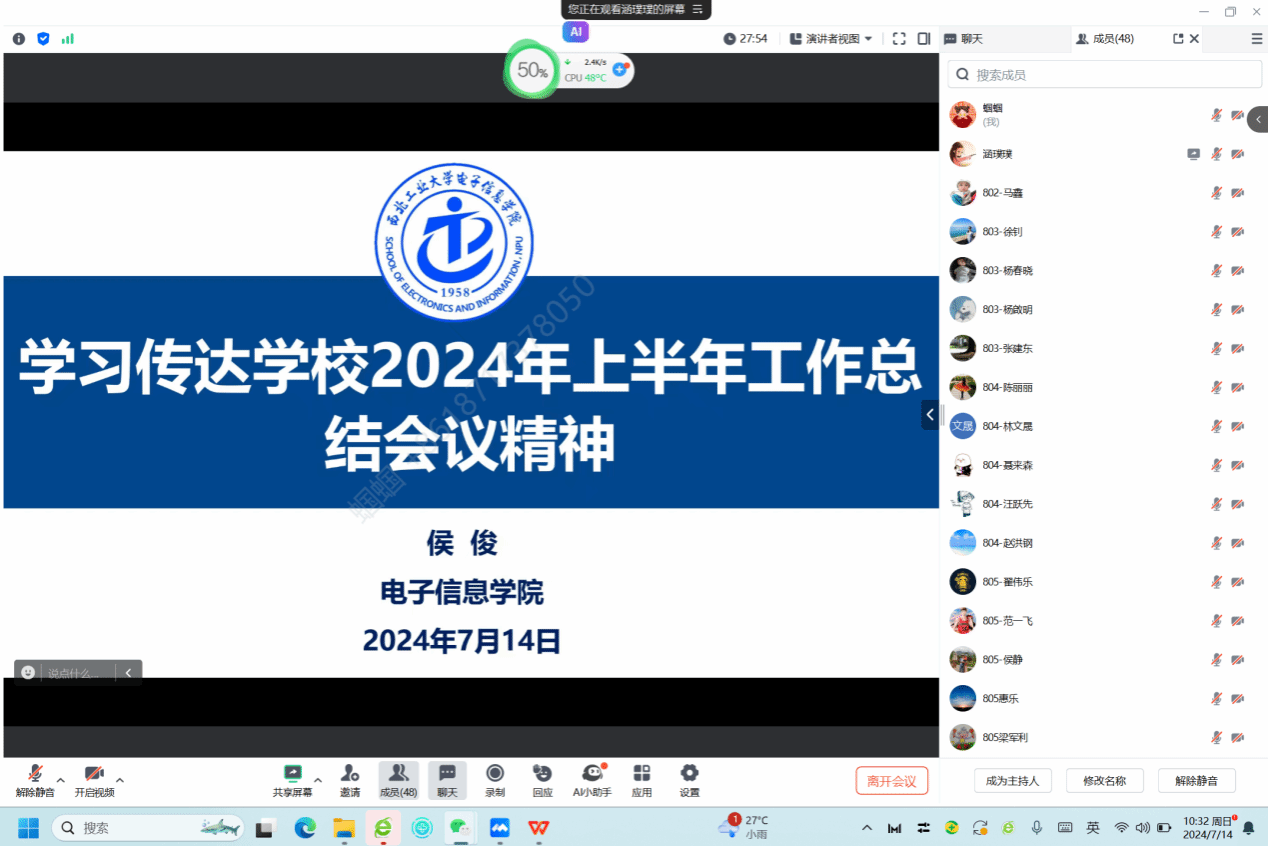随后侯俊传达了党委常务副书记程基伟关于学校暑期重点工作部署及安全稳定相关要求,他强调,学院要深入贯彻落实学校暑期工作要求,做好党纪学习教育总结工作和学校第十四次党代会筹备工作、精心组织学生暑期实践活动、认真抓好为师生办实事等工作。