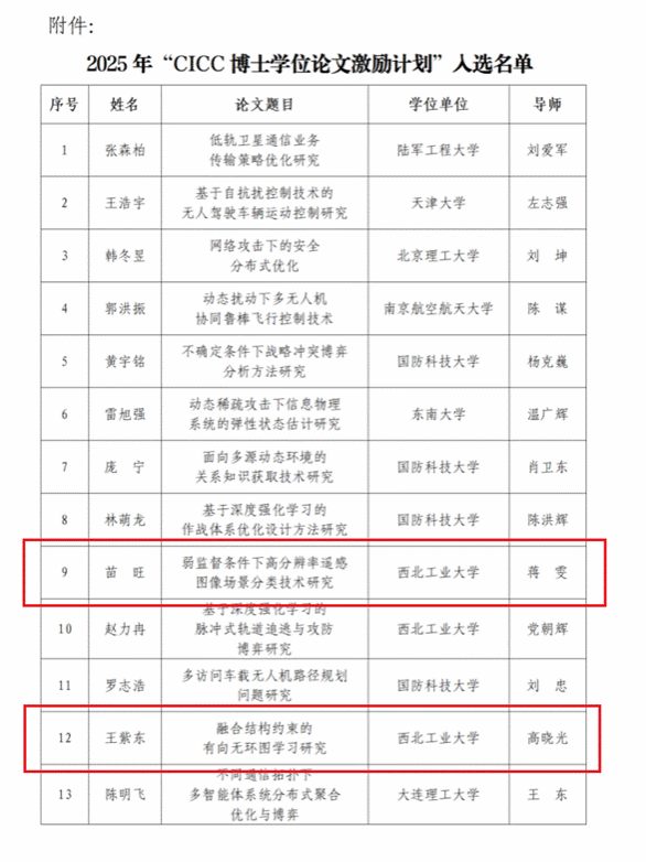 近日,中国指挥与控制学会(CICC)公布了2025年度CICC博士学位论文激励计划的评审结果,我院博士毕业生苗旺(导师:蒋雯教授)、王紫东(导师:高晓光教授)的博士学位论文成功入选。