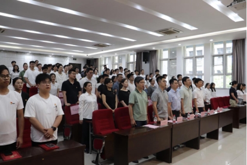 伴随着庄严的国歌声,表彰大会拉开帷幕。在党委委员戴玉超的带领下,全体党员起立,面向党旗,庄严宣誓,一同重温入党誓词。学院党委书记侯俊宣读《走光
