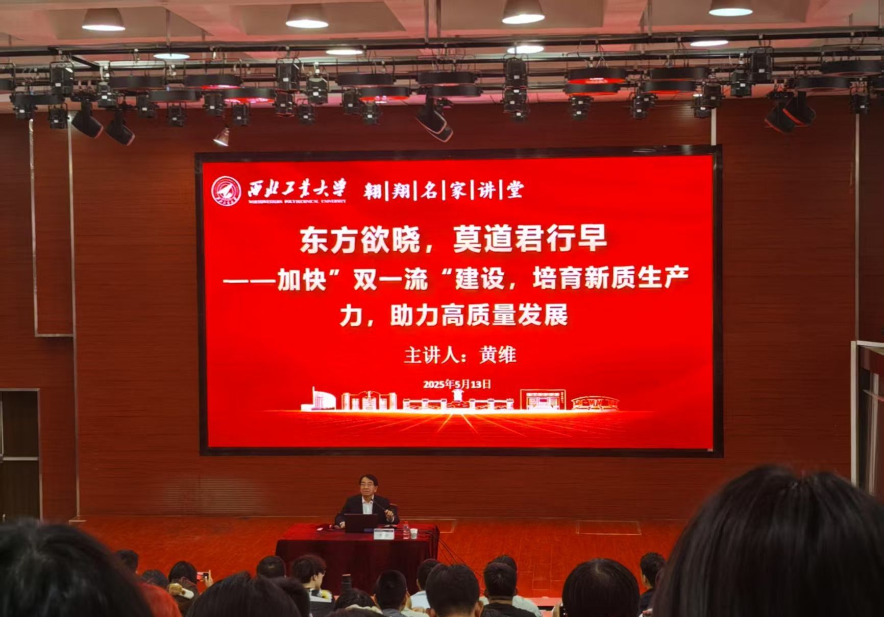 《东方欲晓,莫道君行早——加快‘双一流’建设,培育新质生产力,助力高质量发展》,黄维院士在授课中指出,新时代我国科技发展成就斐然,“双一流”建设意义深远。面向未来,重点布局新一代信息技术等战略性新兴与未来产业,将极大推动经济增长模式升级。通过对顶尖高校与人才驱动产业升级路径的深度剖析,强调新质生产力以“新”为起点、“质”为关键,勉励广大青年学子要积极投身交叉领域研究,在科技自立自强的征程中勇担时代使命,以创新活力为“双一流”建设与新质生产力培育注入青春动能。