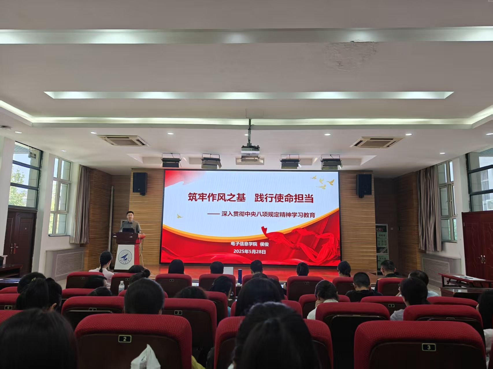 最后,由学院党委书记侯俊以《筑牢作风之基,践行使命担当——深入贯彻中央八项规定精神学习教育》为主题授课,为大家讲解了中央八项规定及其实施细则的内涵与重要性。从中央八项规定出台的背景,到每一项具体内容的剖析,再到如何在实际工作中贯彻执行,侯俊结合了大量生动的案例,让大家深刻认识到这些规定绝不是空洞的口号,而是切实关乎党的形象、关乎国家长治久安的行动准则。
