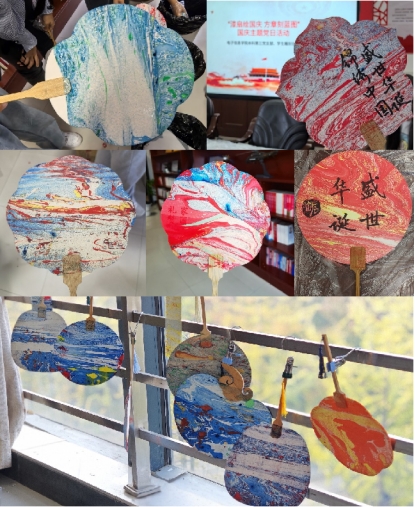 雕刻体验活动结束后,大家开始了漆扇体验活动。大家按照自己的构思将不同颜色的漂漆混合在水中,有的以红色和黄色为主题色,构筑国泰民安、欣欣向荣的盛世画卷,表达对祖国繁荣、人民幸福的美好祝愿;有的则以蓝色为扇面主题色,紧扣我校“三航”特色,寄予科技水平不断进步、校园事业蓬勃发展的寓意。漆扇制作完成后,大家在扇面上写上祝福语并盖上亲手雕刻的印章,为本次活动圆满收官。